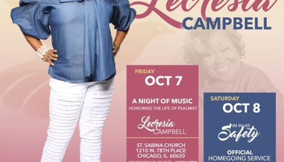 A Night of Music, honoring the life of Psalmist Lecresia Campbell will take place on Friday, October 7th at 7p.m. at St. Sabina Church, 1210 W. 78th Place, Chicago, IL.