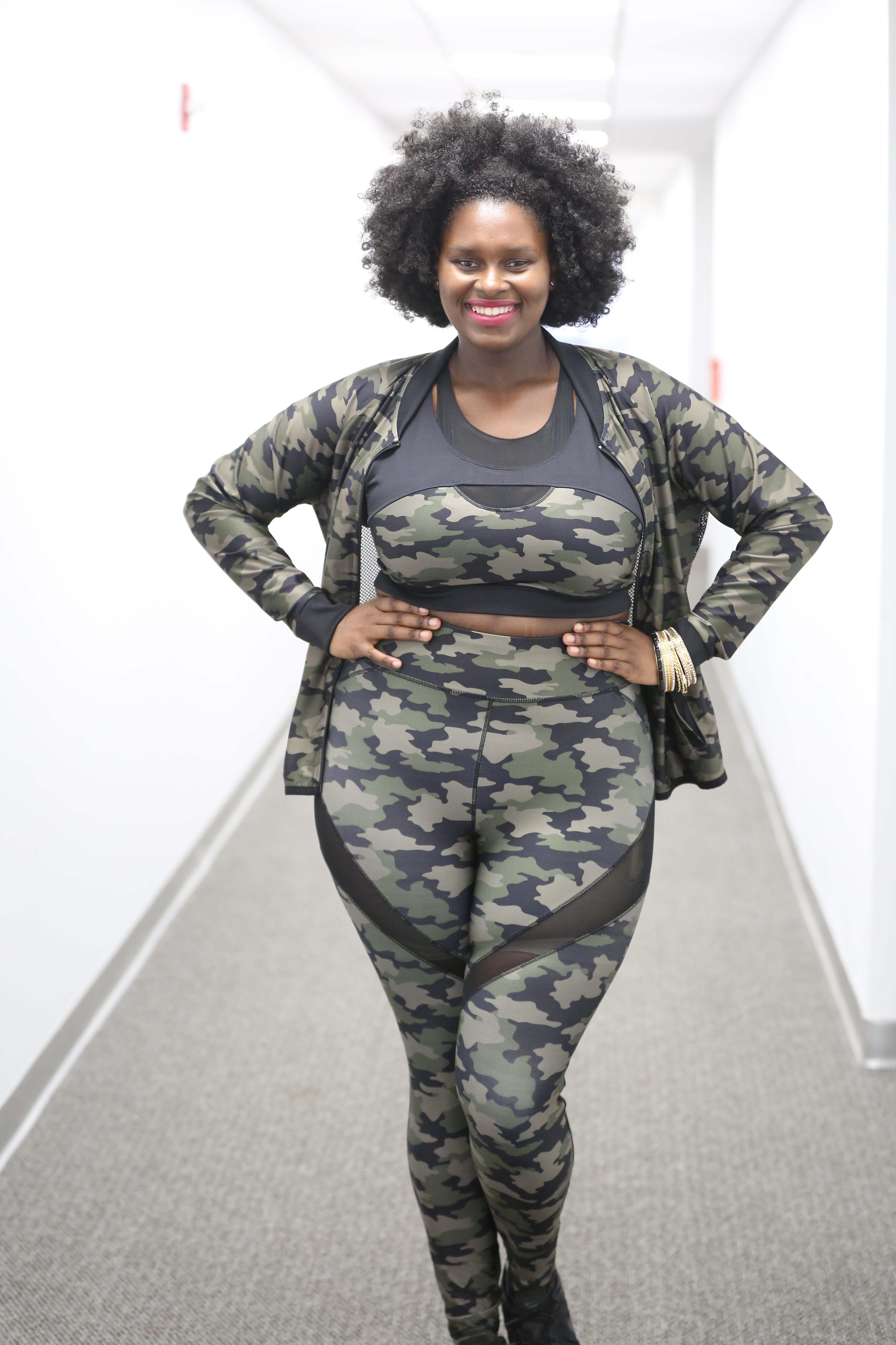 Camouflage is on trend for Spring/Summer 2017 and this all over camo print is sure to make you stand out, not hide! We are loving these camo leggings with their stylish met cut-out. The shape of the cutout is also flattering for thicker thighs, minimizing them. Show a little skin, while still being reserved. Oh, so sexy! Use the promo code: HelloBeautiful for 10% off on your online order. The matching sports bra is not only cute, but functional. The double layer of mesh looks hot, while keeping you cool, and the racerback structure will help give your breasts the support they need. On your way to the gym or when you are leaving, adding this camo jacket (that has an open mesh back) truly sets off the entire LEWK. With your HelloBeautiful promo code, you can get this entire look for under $100.00.